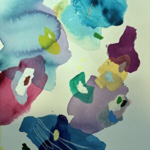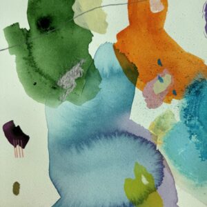 Made with acrylic paint, pencil crayons, threads, yarns, and oil pastels on watercolor paper.