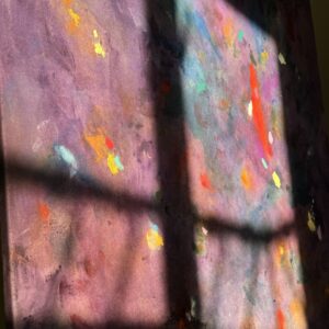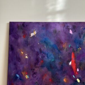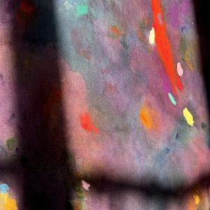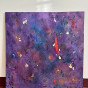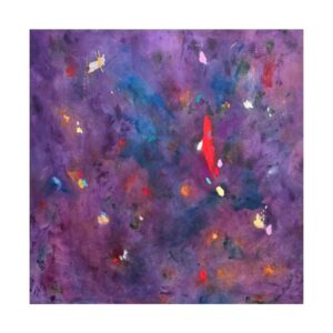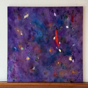 Made with acrylic paint, pencil crayons, threads, yarns, and oil pastels on canvas.